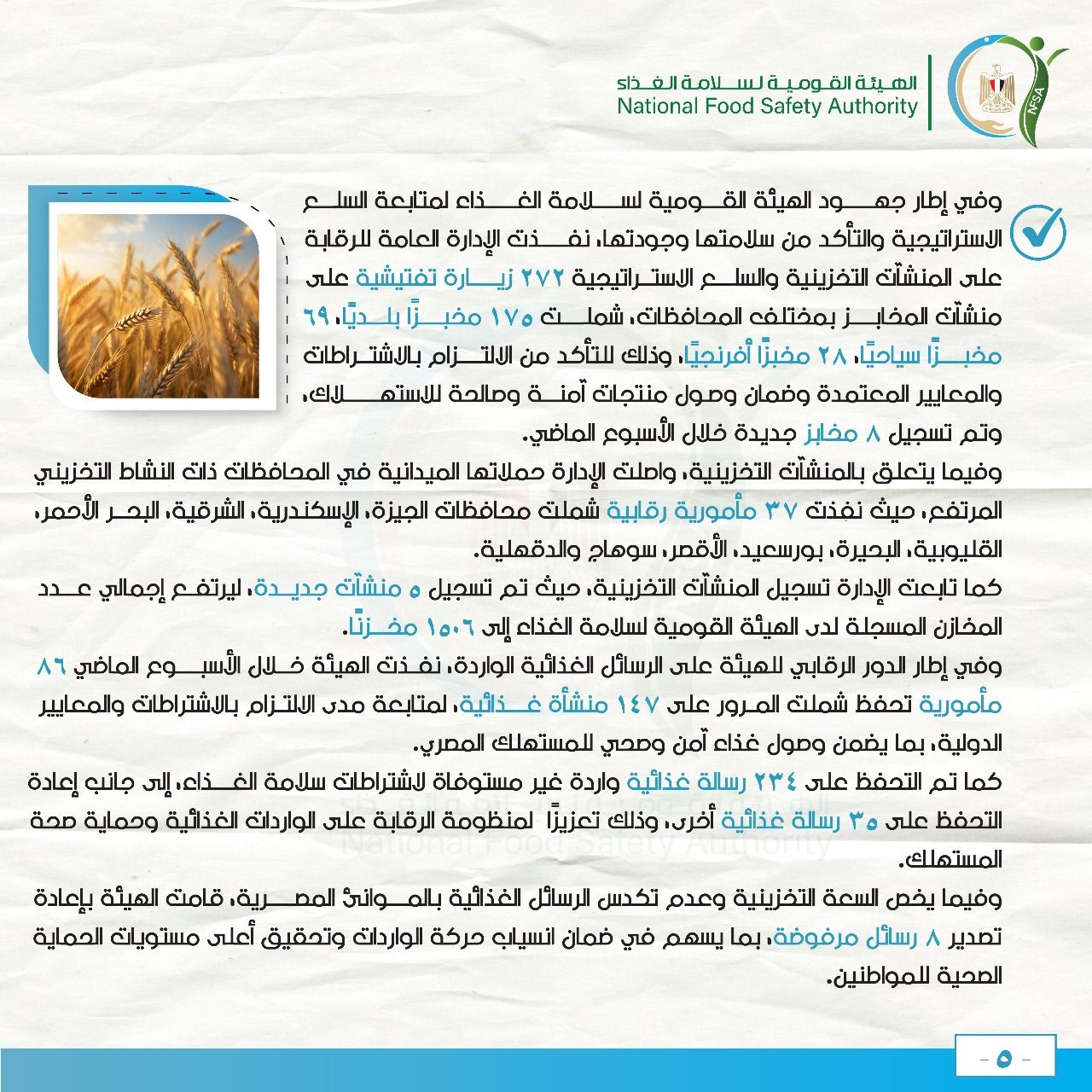 وفي إطار جهود الهيئة القومية لسلامة الغذاء لمتابعة السلع الاستراتيجية والتأكد من سلامتها وجودتها، نفذت الإدارة العامة للرقابة على المنشآت التخزينية والسلع الاستراتيجية 272 زيارة تفتيشية على منشآت المخابز بمختلف المحافظات، شملت 175 مخبزًا بلديًا، 69 مخبزًا سياحيًا، 28 مخبزًا أفرنجيًا، وذلك للتأكد من الالتزام بالاشتراطات والمعايير المعتمدة وضمان وصول منتجات آمنة وصالحة للاستهلاك، وتم تسجيل 8 مخابز جديدة خلال الأسبوع الماضي.