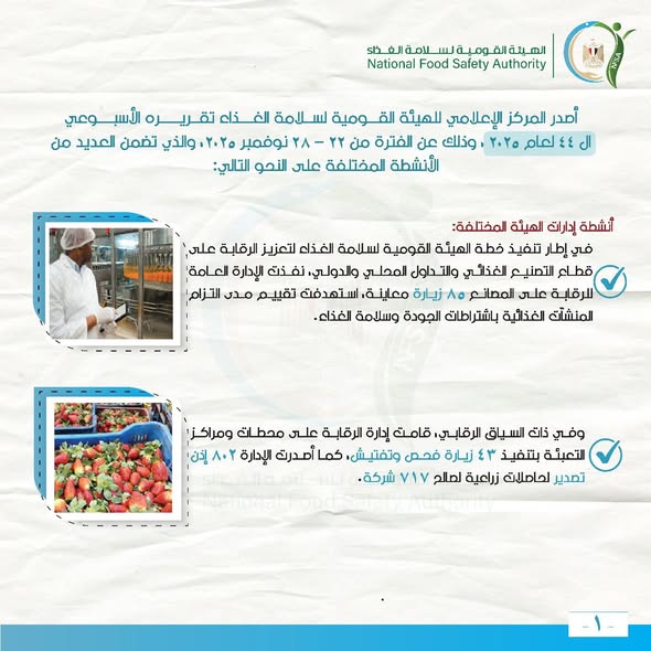 الهيئة القومية لسلامة الغذاء تصدر تقريره الأسبوعي الـ44 لعام 2025 – المؤشرات نت