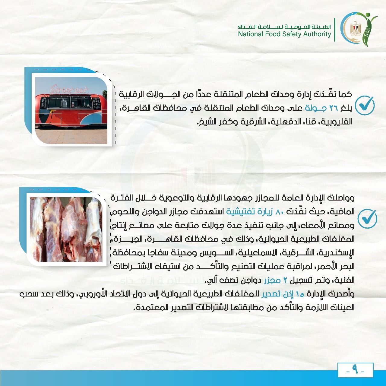 كما نفّذت إدارة وحدات الطعام المتنقلة عددًا من الجولات الرقابية بلغ 26 جولة على وحدات الطعام المتنقلة في محافظات القاهرة، القليوبية، قنا، الدقهلية، الشرقية وكفر الشيخ.