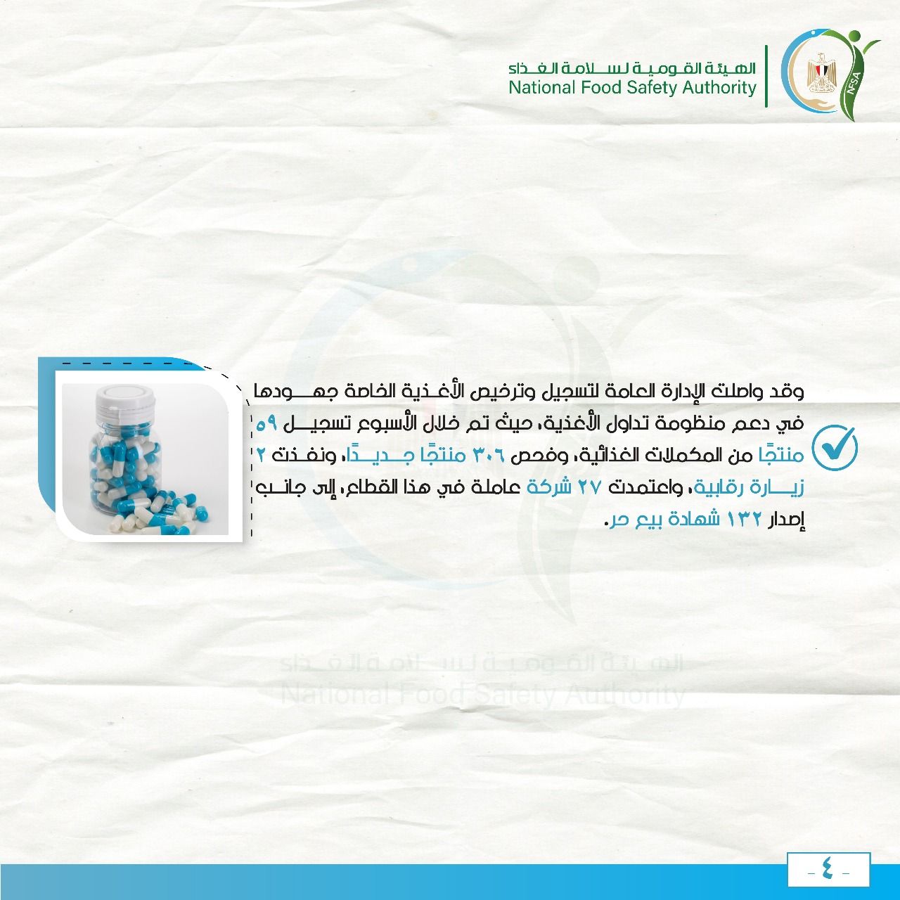 وقد واصلت الإدارة العامة لتسجيل وترخيص الأغذية الخاصة جهودها في دعم منظومة تداول الأغذية، حيث تم خلال الأسبوع تسجيل 59 منتجًا من المكملات الغذائية، وفحص 306 منتجًا جديدًا، ونفذت 2 زيارة رقابية، واعتمدت 27 شركة عاملة في هذا القطاع، إلى جانب إصدار 132 شهادة بيع حر.