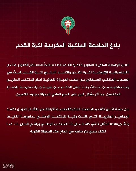 وأعلنت الجامعة الملكية المغربية لكرة القدم، في بيان رسمي، عزمها اللجوء إلى المساطر القانونية لدى كل من الاتحاد الدولي لكرة القدم «فيفا»، والاتحاد الأفريقي لكرة القدم «كاف»، من أجل الحسم في الأحداث التي شهدها نهائي كأس أمم أفريقيا، والذي جمع المنتخب المغربي بنظيره السنغالي.