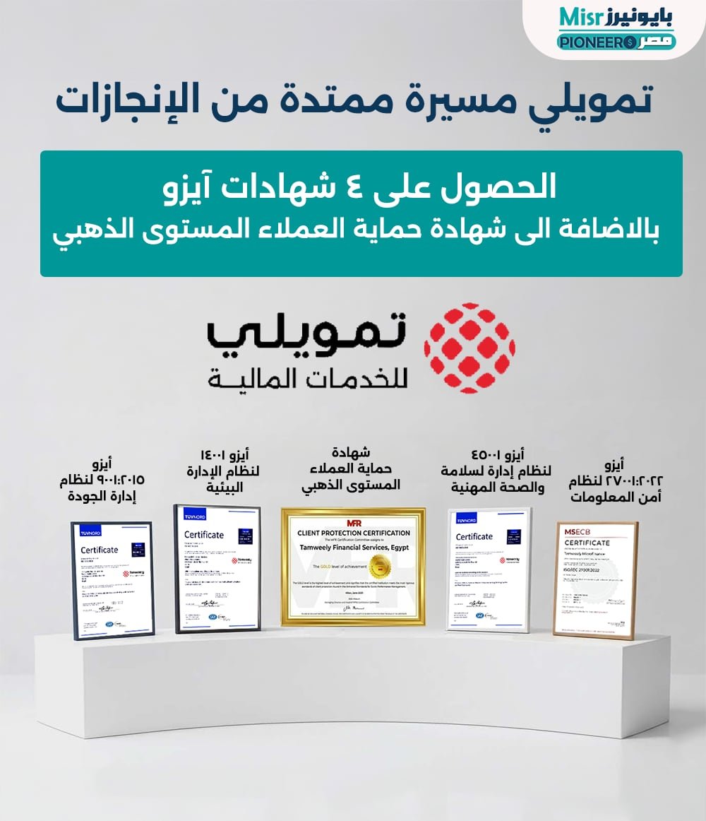واصلت شركة تمويلي تعزيز مكانتها الرائدة في قطاع الخدمات المالية غير المصرفية، بعدما نجحت في الحصول على نحو 4 شهادات آيزو دولية إلى جانب شهادة حماية العملاء – المستوى الذهبي، في خطوة تعكس التزامها بتطبيق أعلى معايير الجودة والحوكمة وأمن المعلومات.